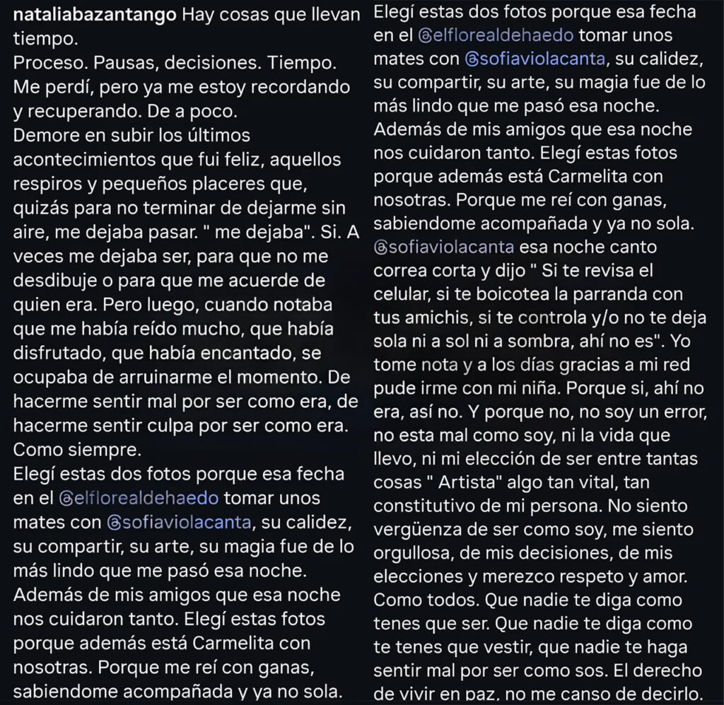 En su publicación, Bazán habló de recuperar su identidad y su libertad emocional, y lanzó frases que interpretadas como una clara referencia a su relación con Sabbatella: